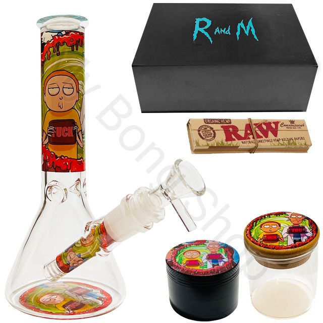 Attention all Rick and Morty fans! Get ready to elevate your smoking experience with the small all glass Rick and Morty themed bong and gift set. This bong and gift set is designed with the iconic characters from the hit TV show, making it a must have for any fan!